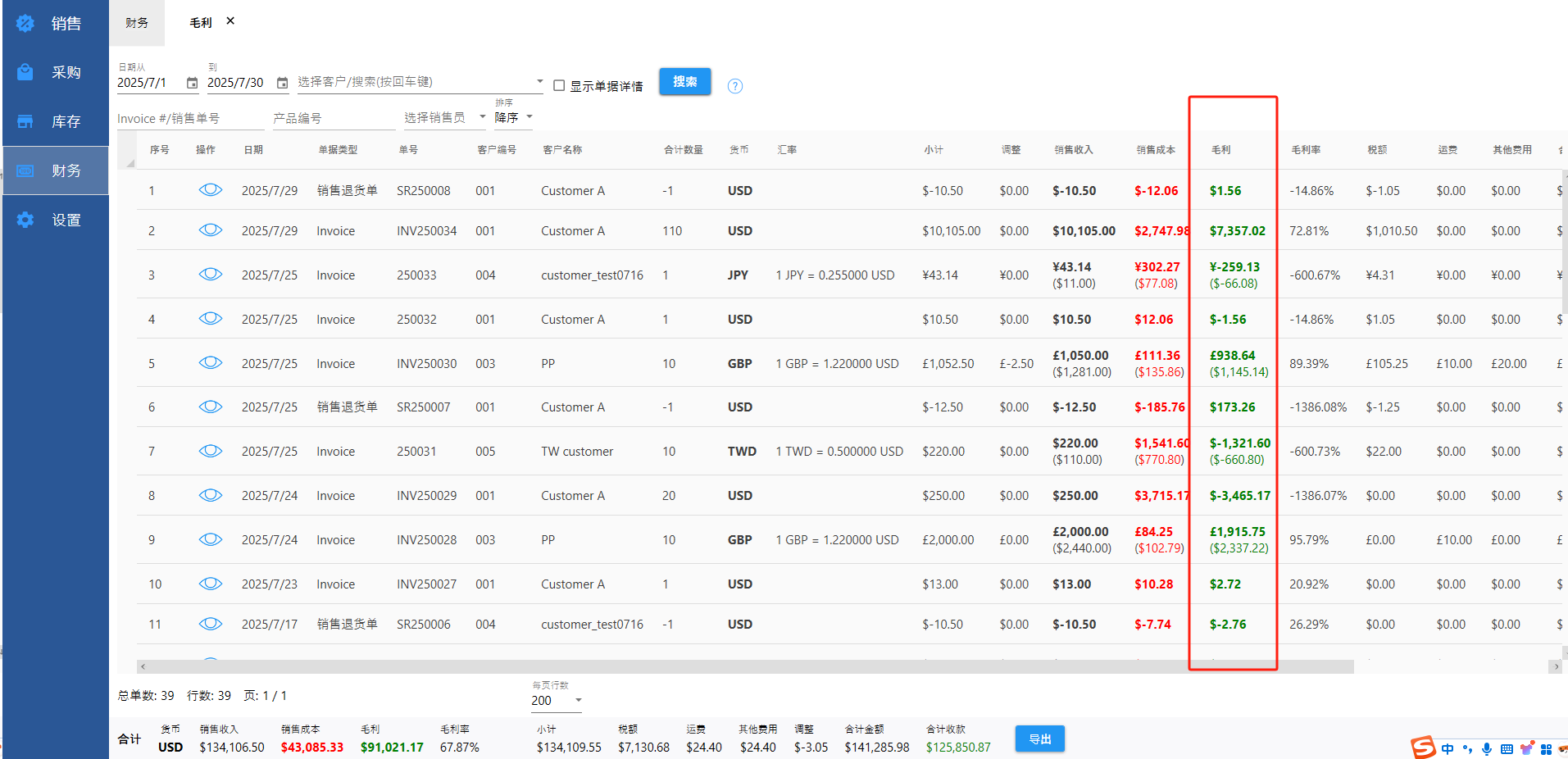 可以查看每一张Invoice 的毛利润。