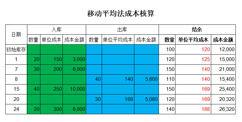 从上表中可以看出,那么日期1的结余单位平均成本=(12000+3000)/(100+20)=125