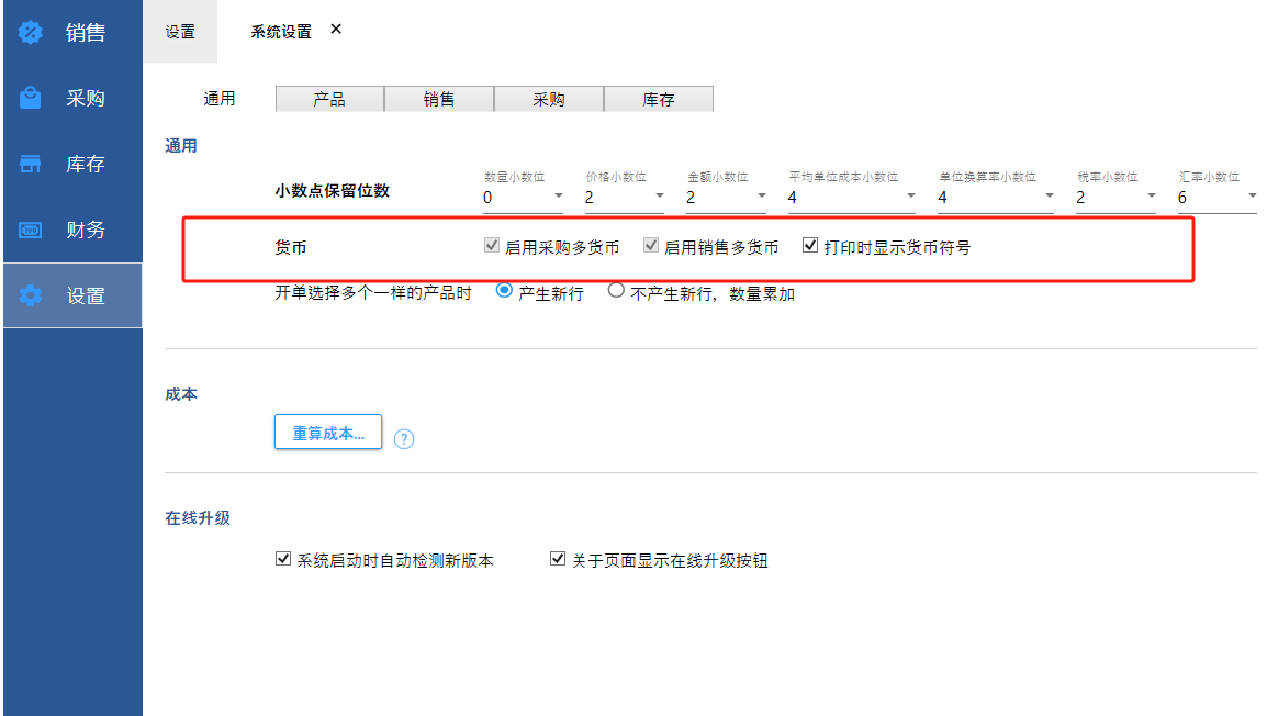 根据需要,是否启用采购多货币和销售多货币,可以只开启一个,也可以开启两个。
