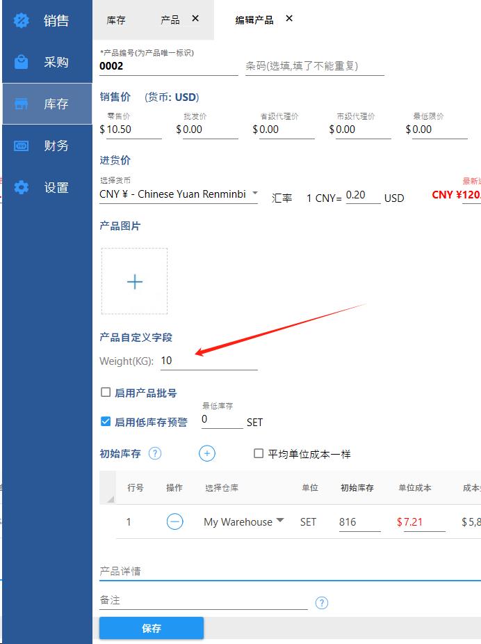 比如您需要产品信息中有重量,但系统产品信息中没有这个,这时可以启用自定义产品字段。