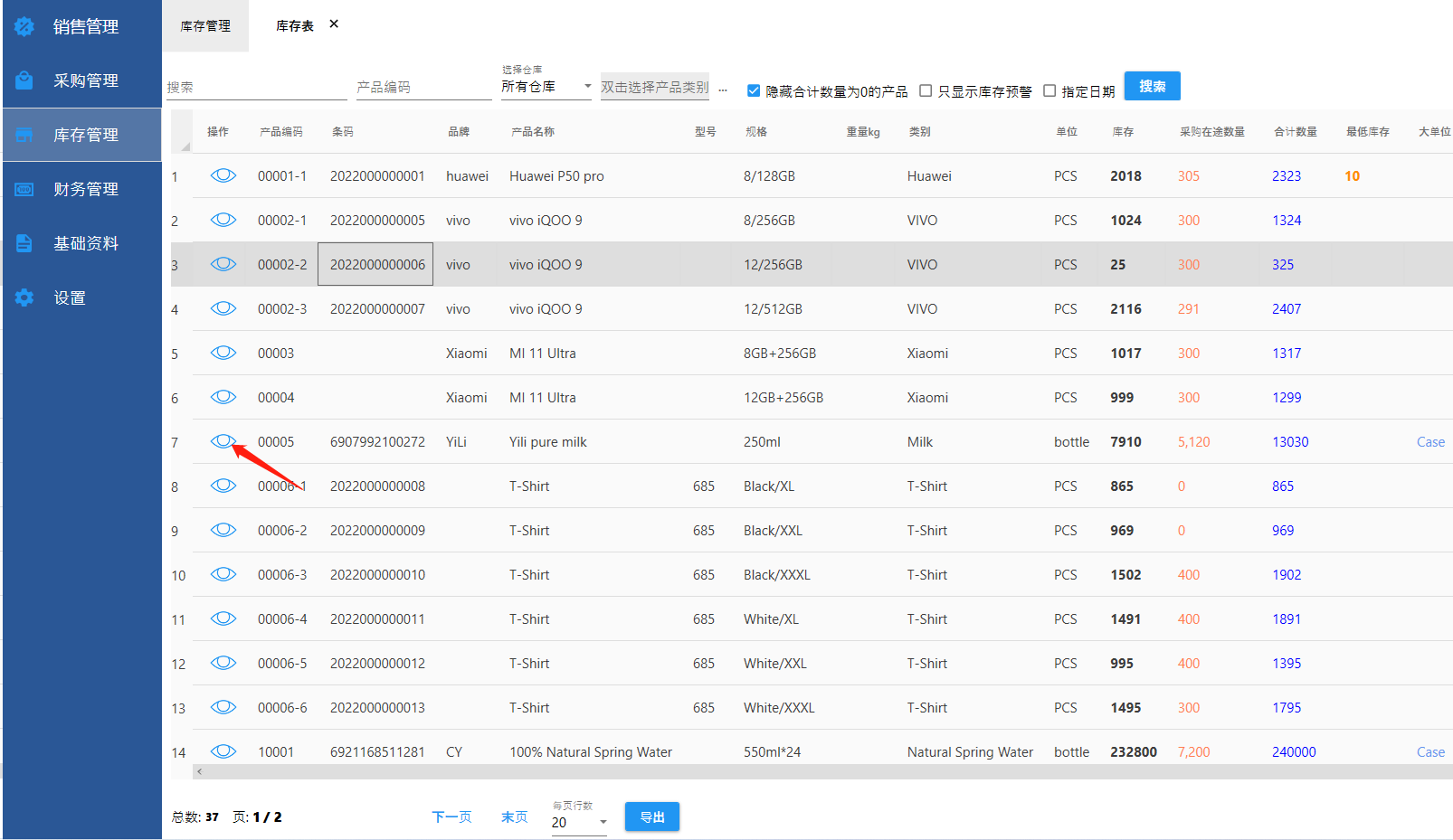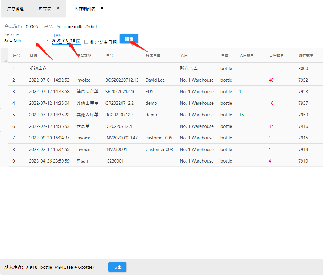 找到库存不对的那个产品,单击上图查看图标或双击进入【库存明细表】
