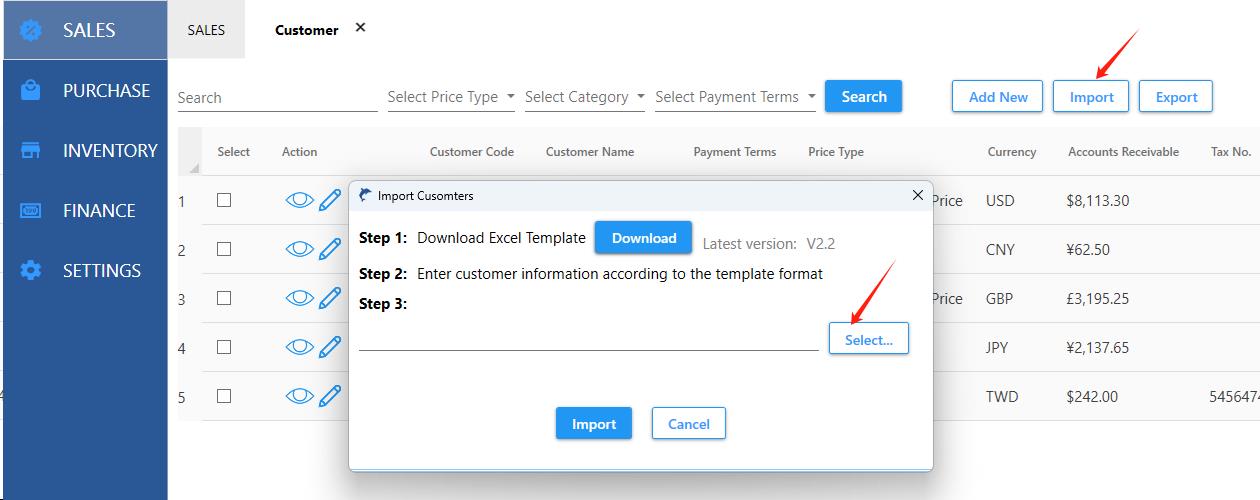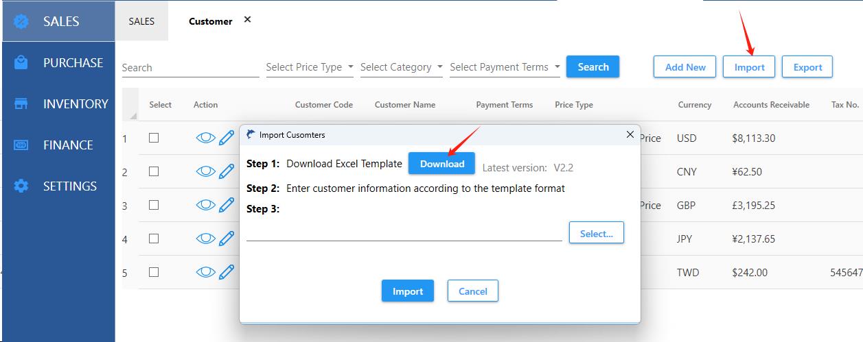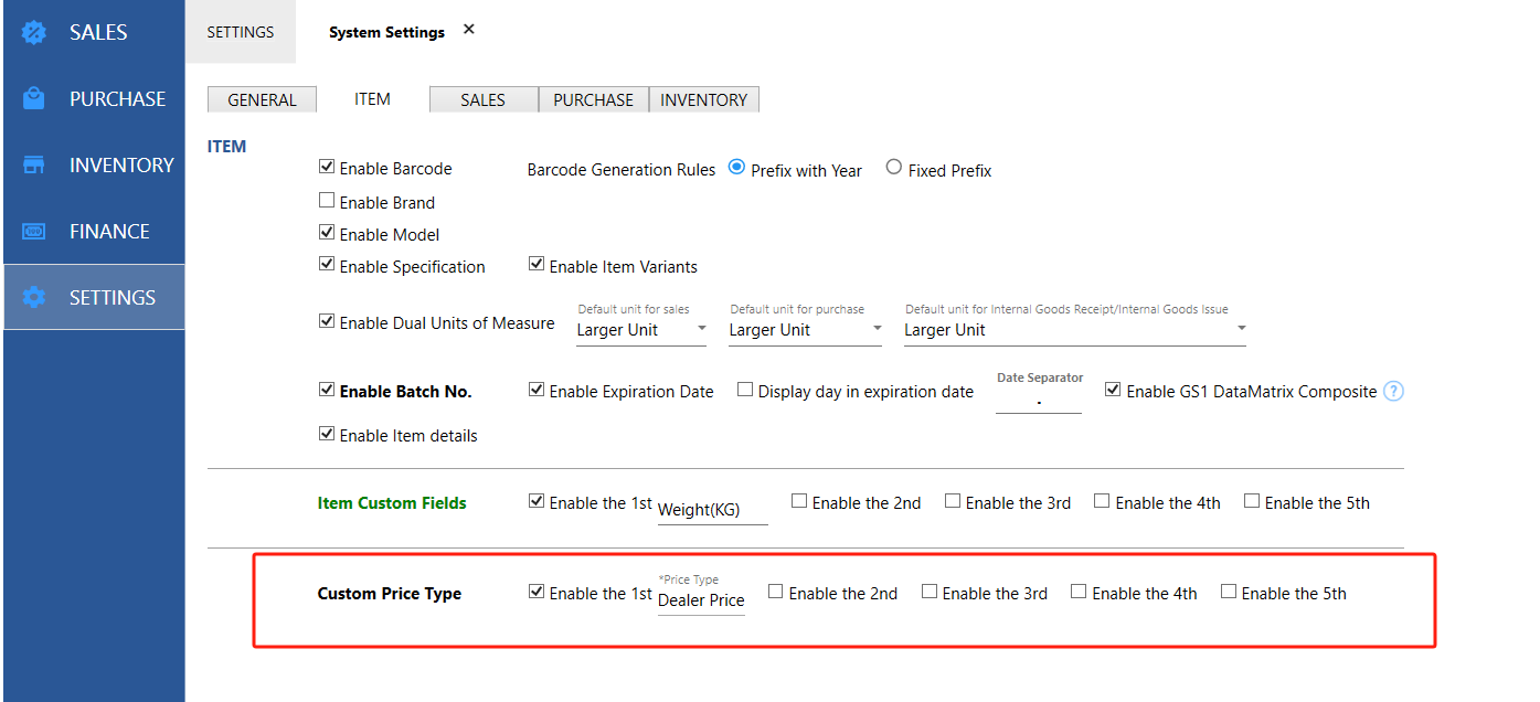 If you need other price types, please go to [Settings] - [System Settings] -ITEM, enable the custom price type, and then re-download the customer import template.