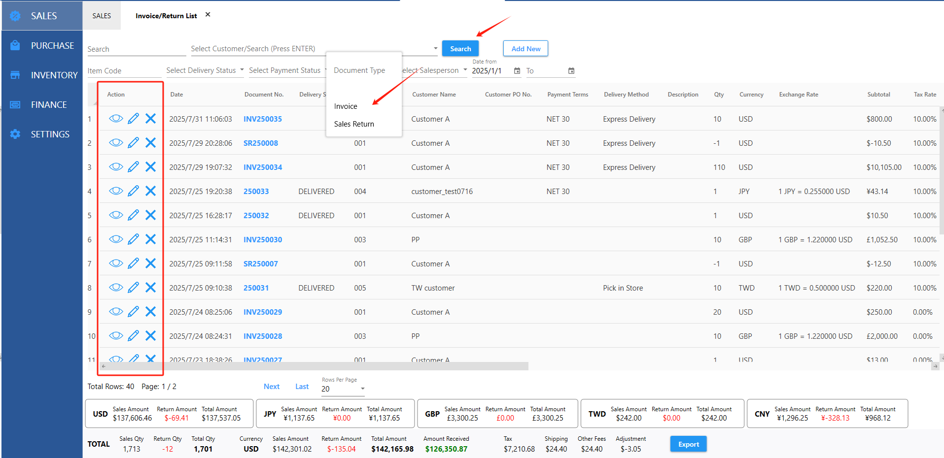 You can view, edit, delete invoice or sales return.