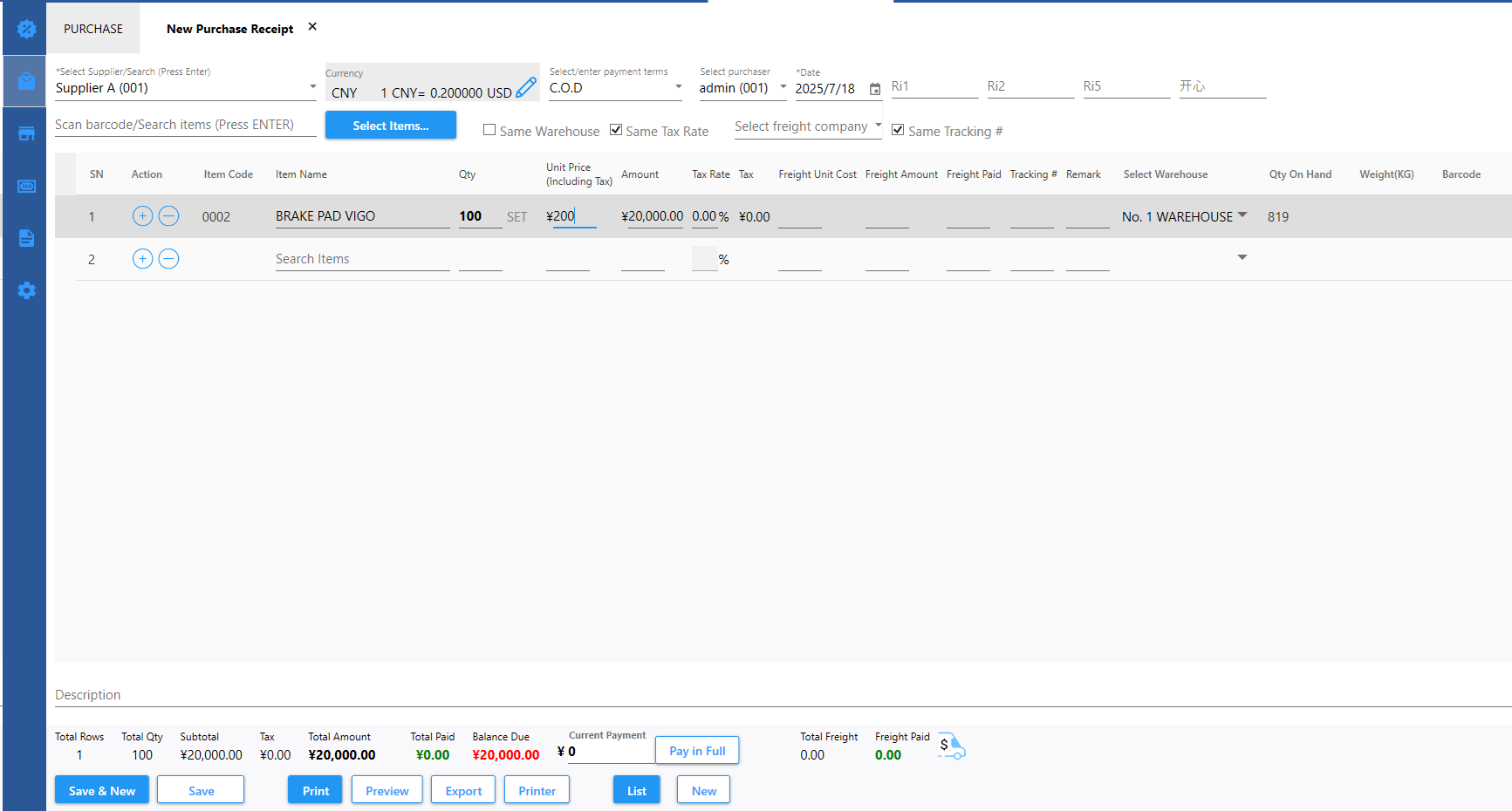 When you receive items from a supplier, you need to create a purchase receipt, the inventory quantity will increase, and accounts payable will be generated if payment is not made.