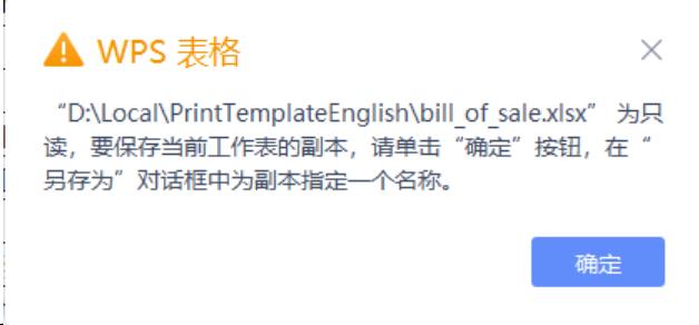 因为如果打印模板文件Excel已经打开过了,再打开一个相同的文件,该Excel会自动变为只读,导致无法保存。保存时会提示以下信息: