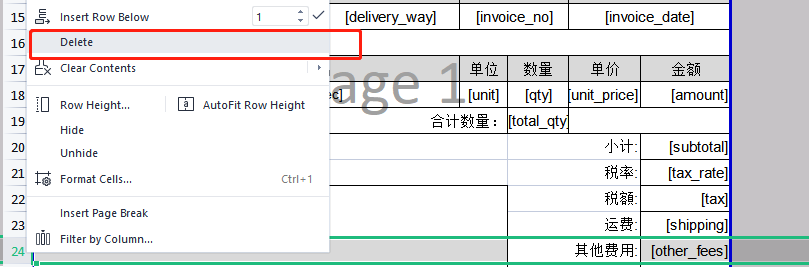 比如不需要【其他费用】,可以把这一行删除。