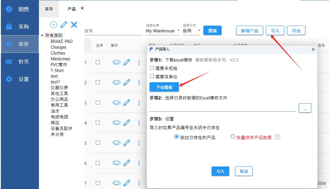 批量导入产品: