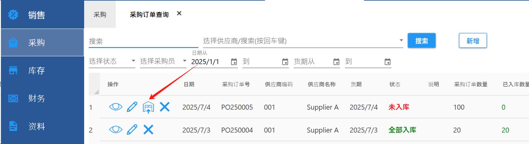 如果之前开过采购订单,在【采购订单查询】可以一键生成采购入库单