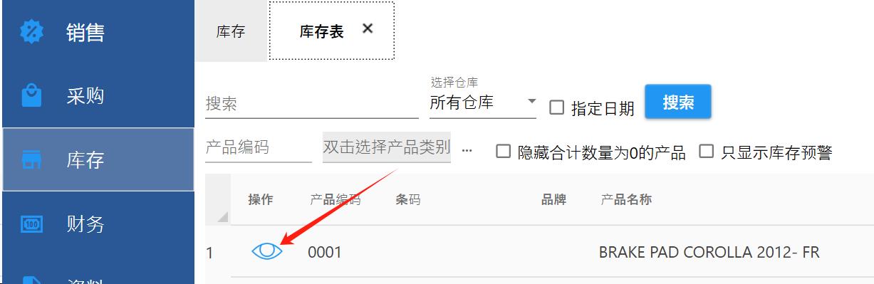 双击或单击上图红色箭头所指的图标,可进入库存明细表