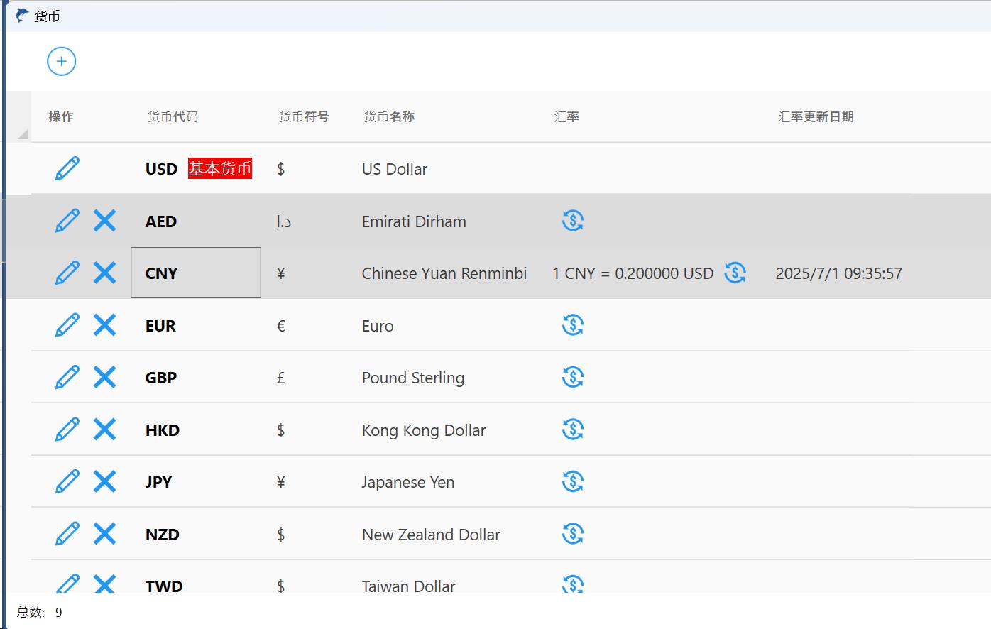 设置基本货币和销售、采购需要的常用货币。