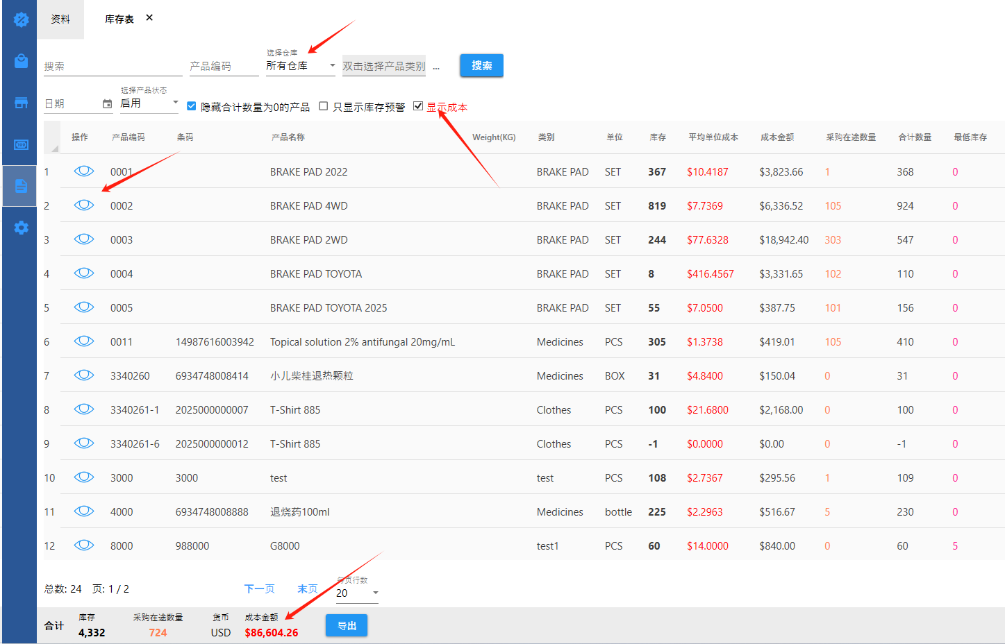 【库存】-【库存表 】