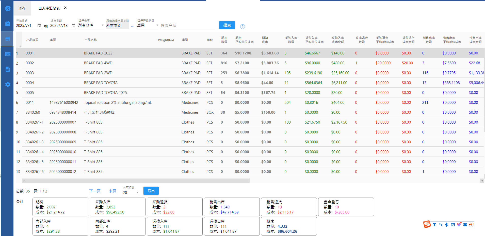 【库存】- 【出入库汇总表】