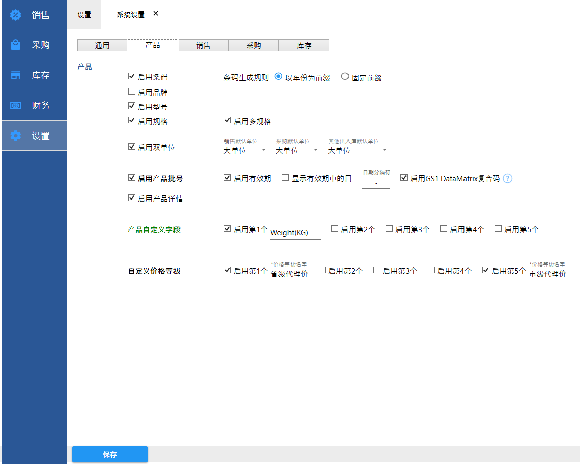 为了更好的匹配您的需求,可以对系统进行设置,如:自定义产品属性,自定义价格等级,税率等等。