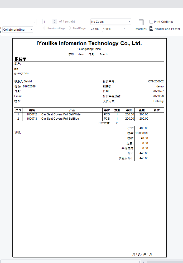 打印模板的表格可以自定义(在【设置】-【打印模板】-【报价单】)