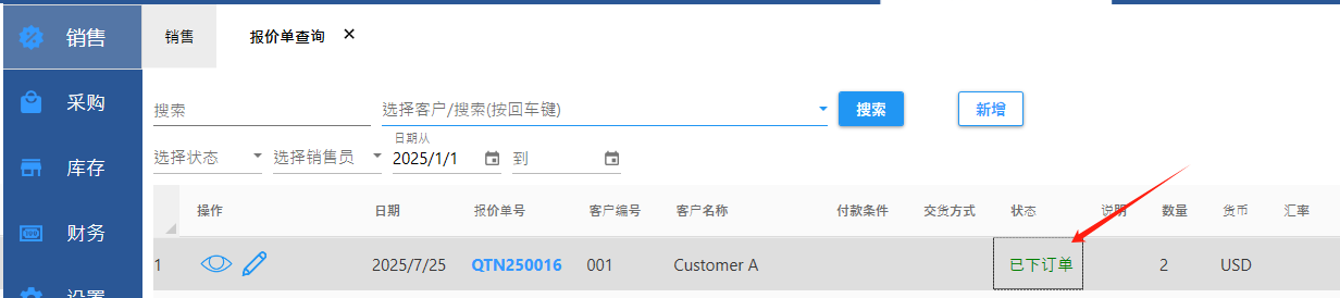 报价单生成了销售订单后,报价单的状态会自动更新为【已下订单】