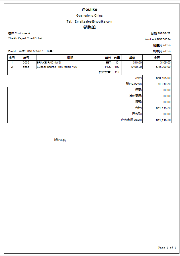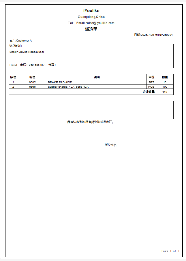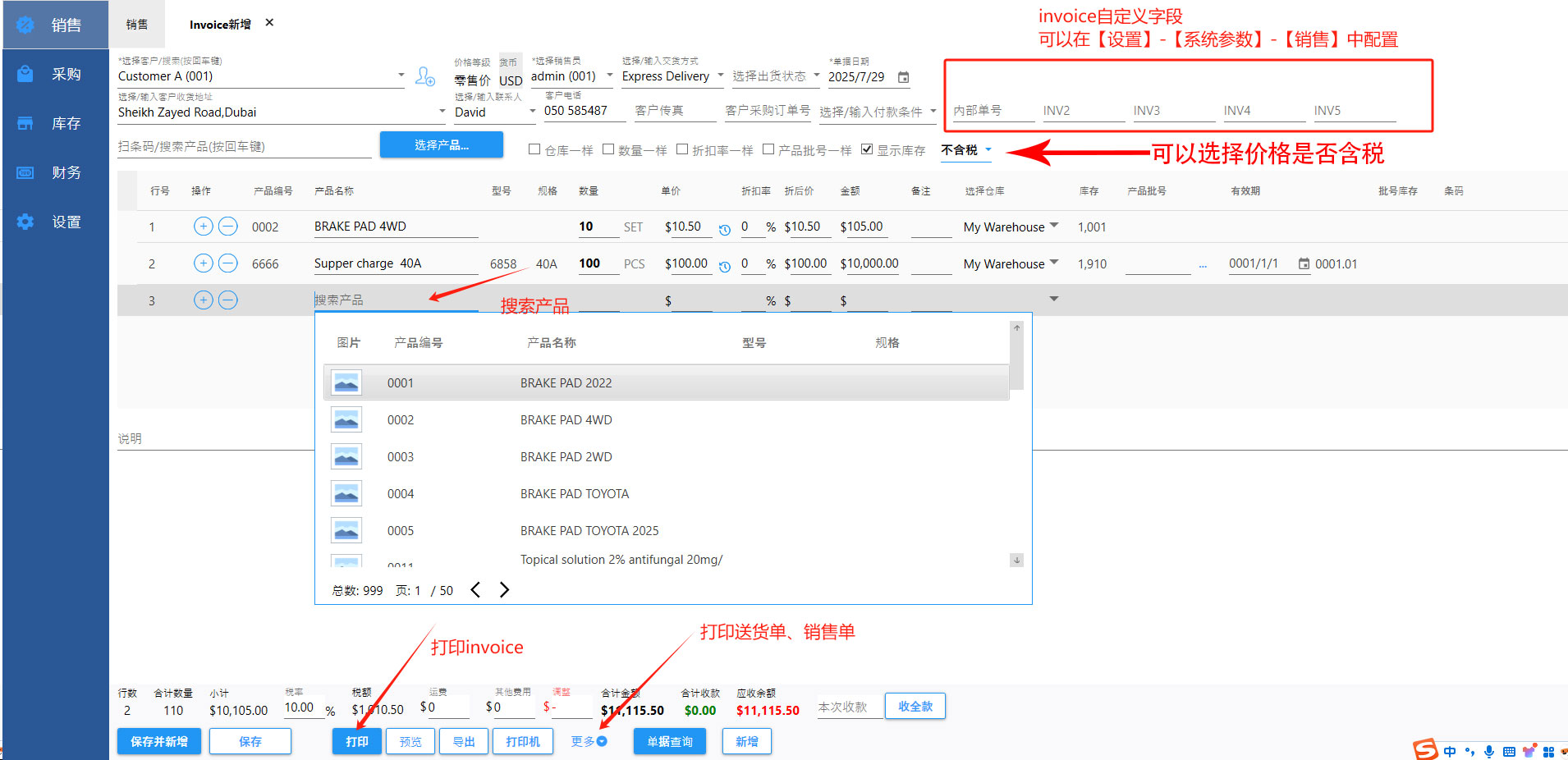 这里除了可以打印Invoice,还可以打印送货单,销售单。 开了Invoice,库存会减少。