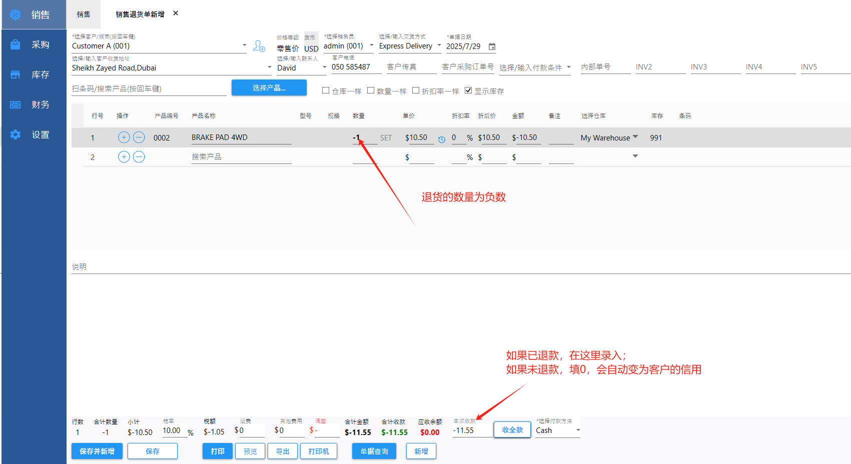 如果已退款给客户,收款输入负数的金额