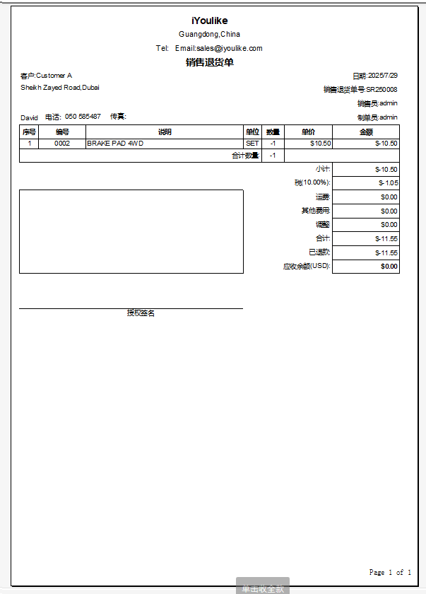 如果未退款给客户,收款填0,