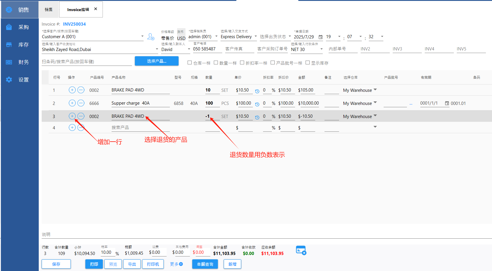B.在原来的Invoice中修改,增加一行数量为负数的产品(负数数量表示退货),然后保存。