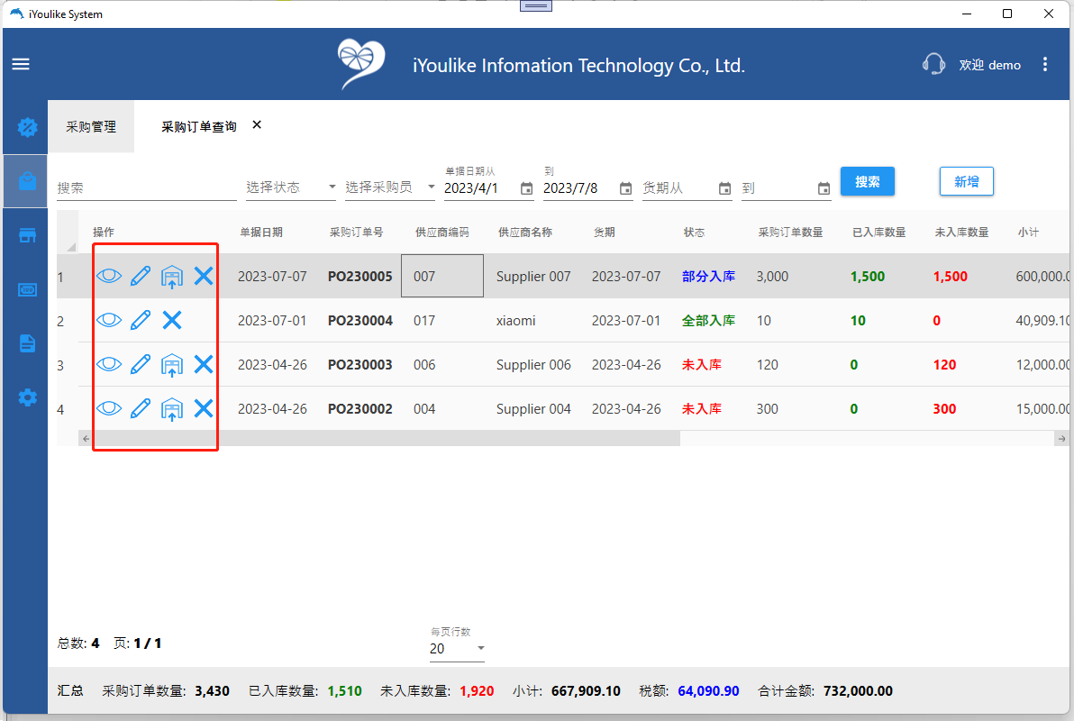 【采购】-【采购订单查询】,可查看编辑所有采购订单。