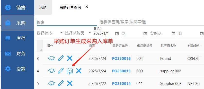 【采购】-【采购订单查询】,可以由采购订单生成采购入库单。