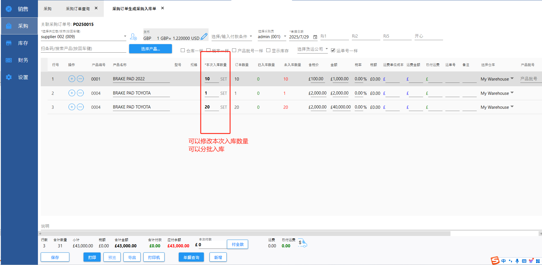 支持分批多次入库。输入实际收到的数量。