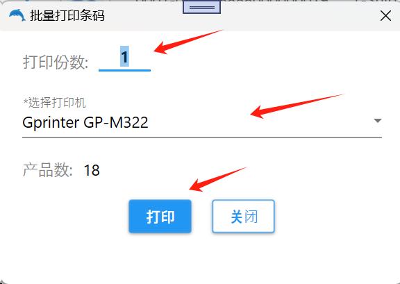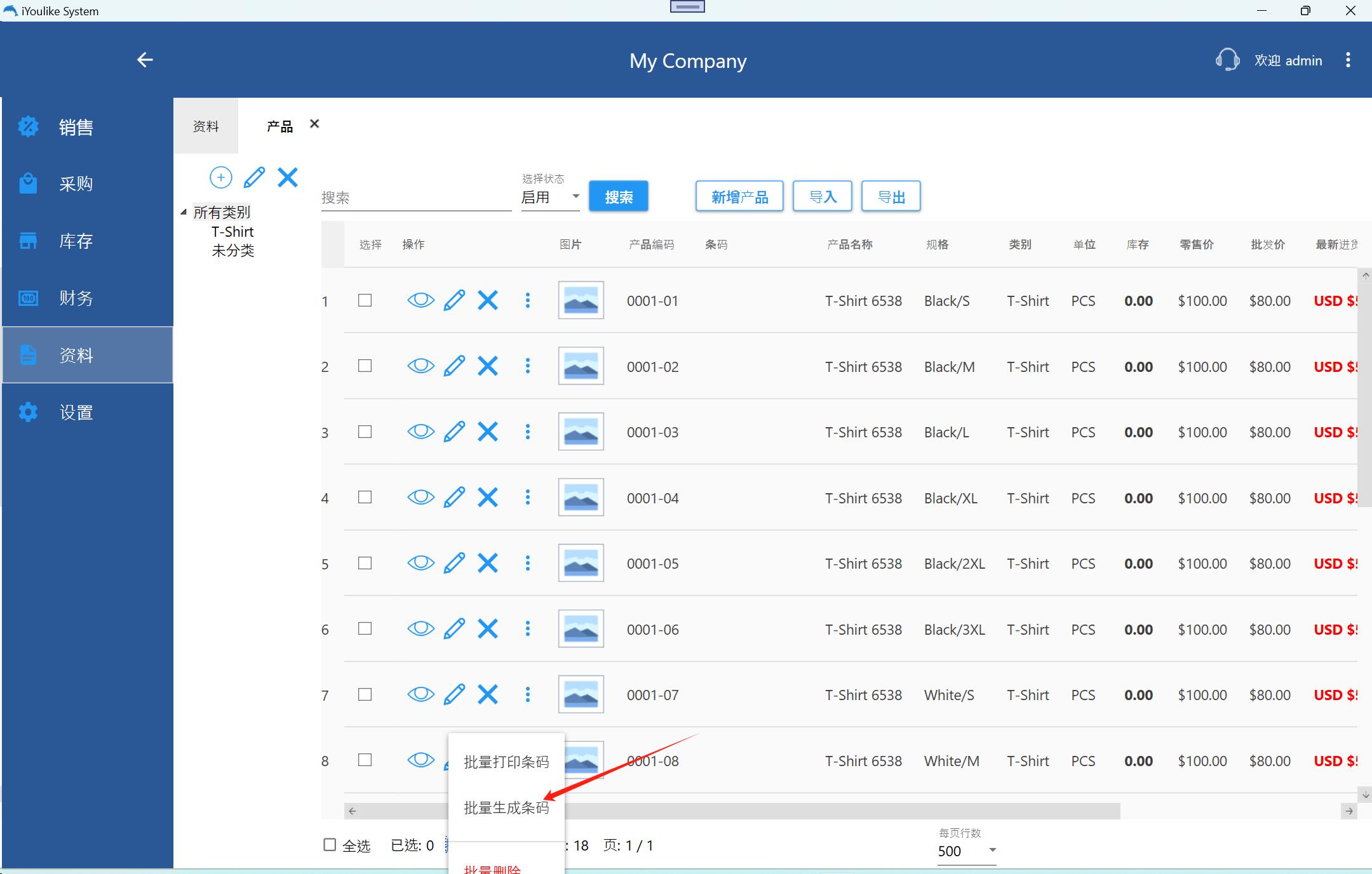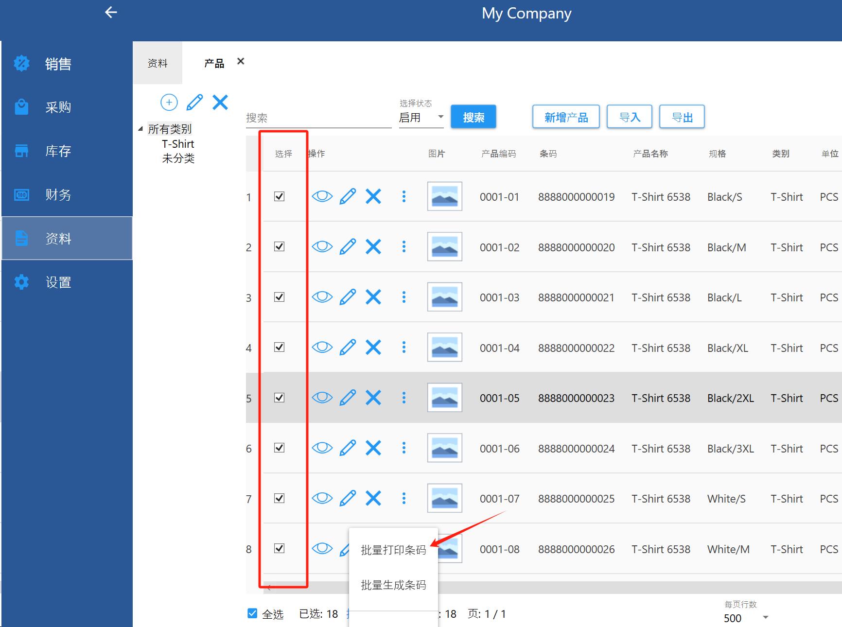 资料-产品,首先选择需要打印条码的产品,批量操作-批量打印条码