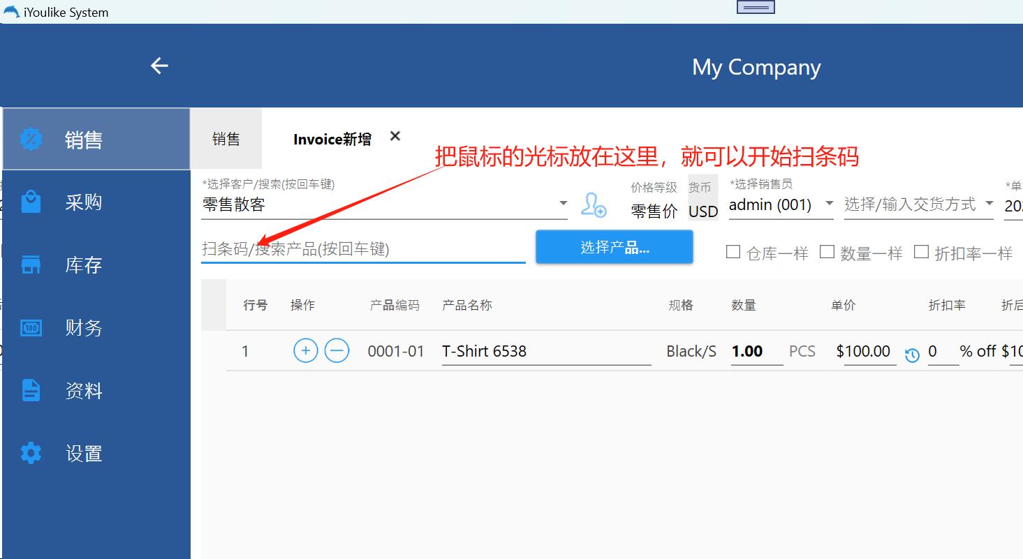 首先选择客户,然后把鼠标的光标放到扫条码的文本框中,就可以扫条码了.