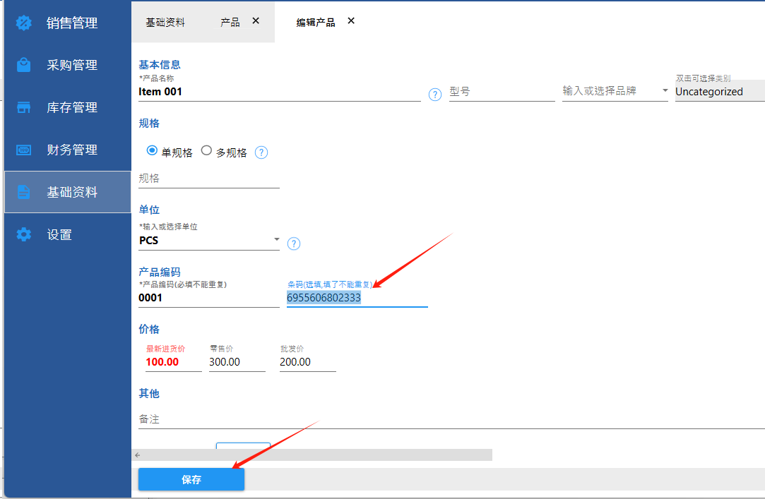 第1种方法是【编辑产品】一个个录入条码;