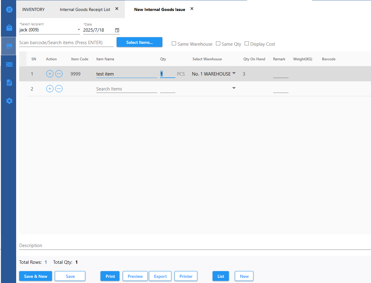 Internal Goods Issue refer to employees applying for items from the warehouse, etc., and creating Internal Goods Issue, the inventory qty will decrease.