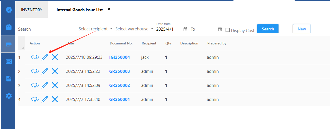 Internal Goods Issue List