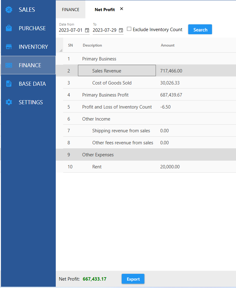 Net Profit = Sales Revenue - Cost of Goods Sold + Other Income - Other Expenses + Profit and Loss of Inventory Count