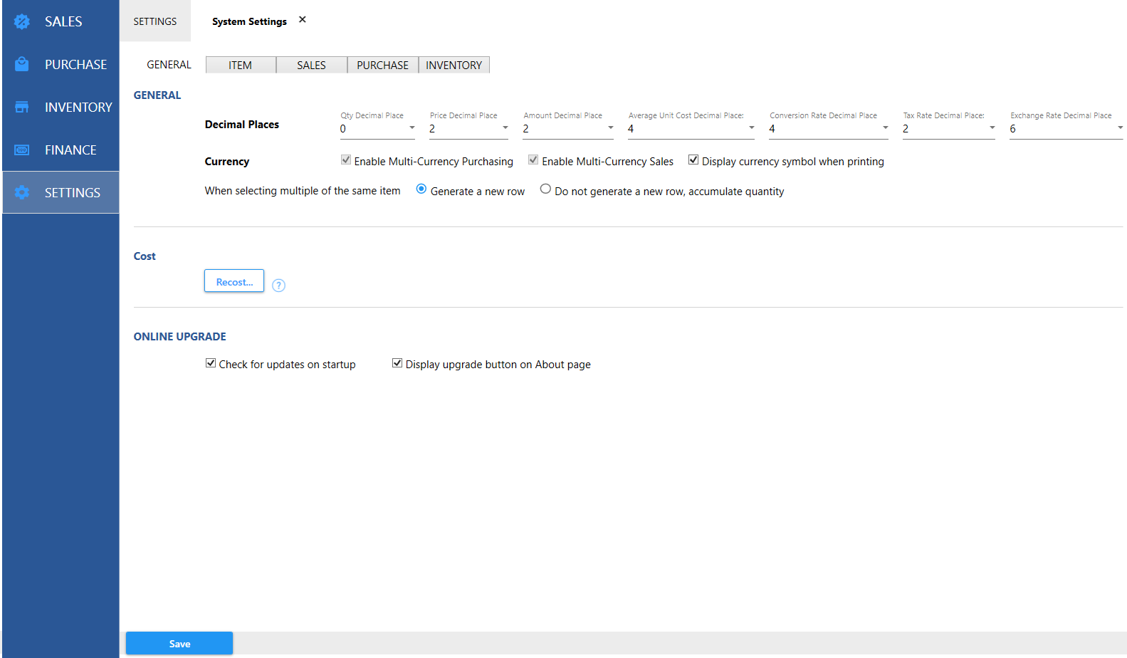 In order to better match your needs, you can set up the system, such as item custom fields, custom price types, tax rates, etc.