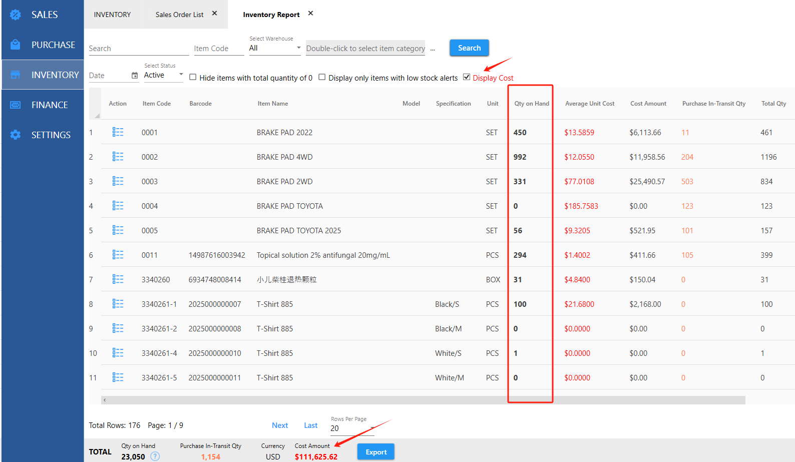 View inventory Qty & cost |