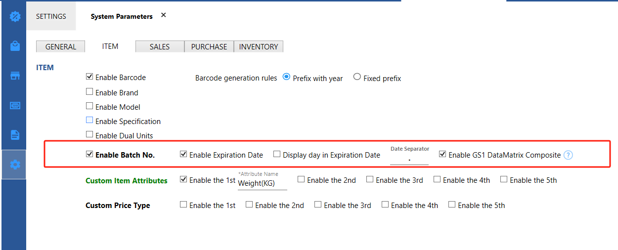 1. Enable batch numbers or expiration date at the system level