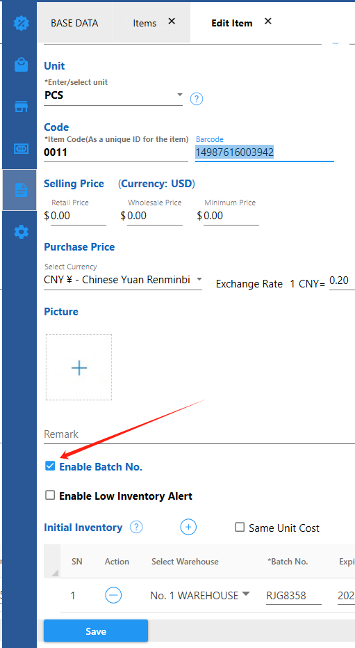 3. Set the batch number of the initial inventory