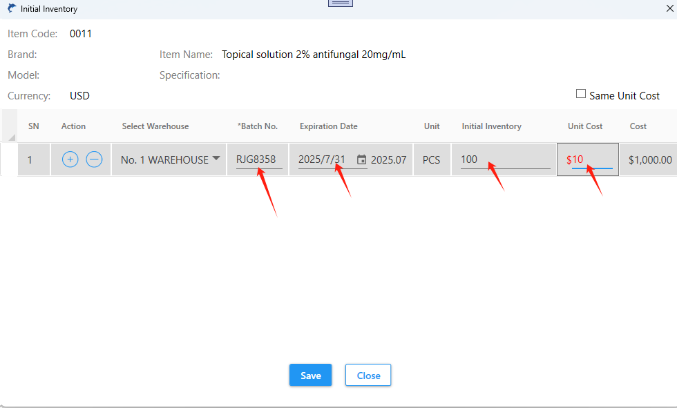 Enter the batch number, expiration date, initial inventory, and unit cost.