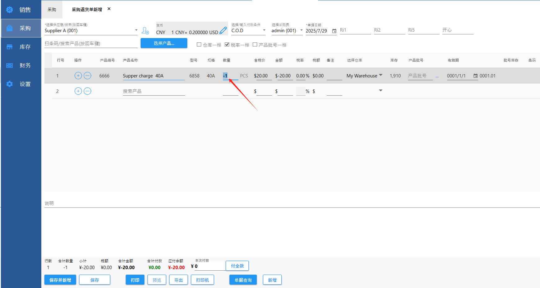 一、新增采购退货单