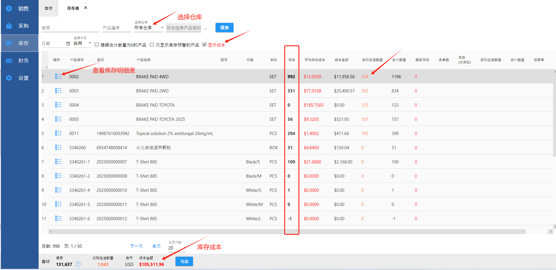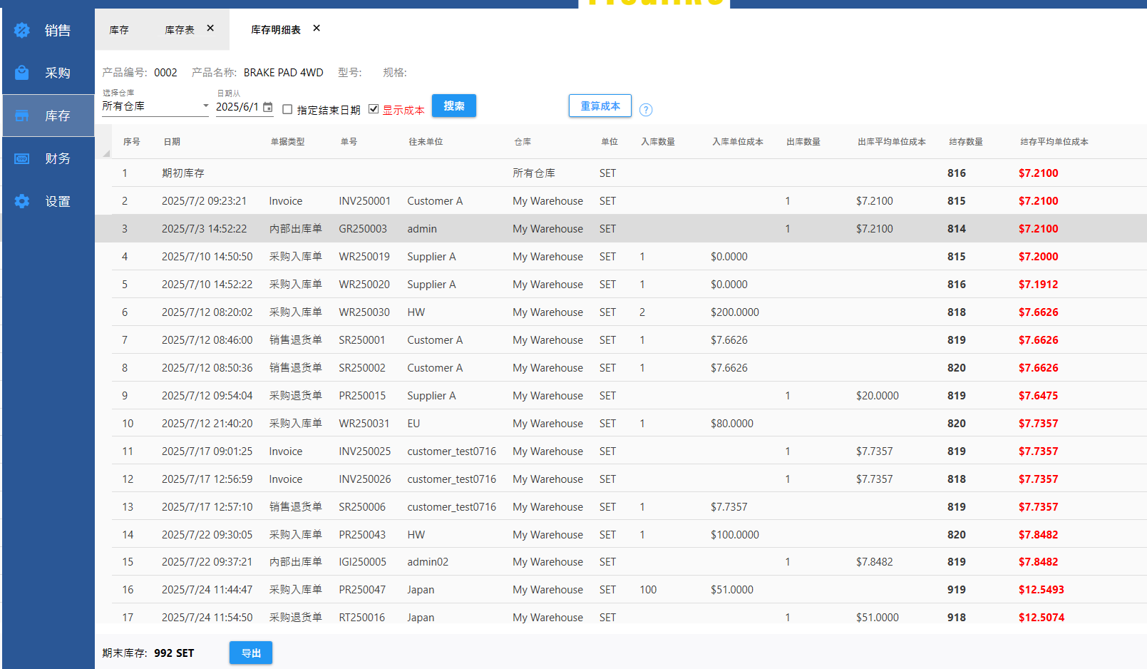 单击上方图标或双击,可查看库存明细表,库存明细表可查看每一笔出入库的记录,通常用于查找库存问题。