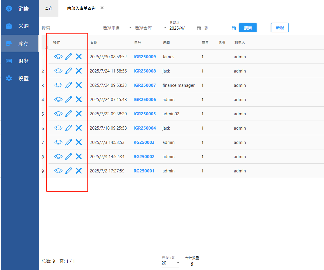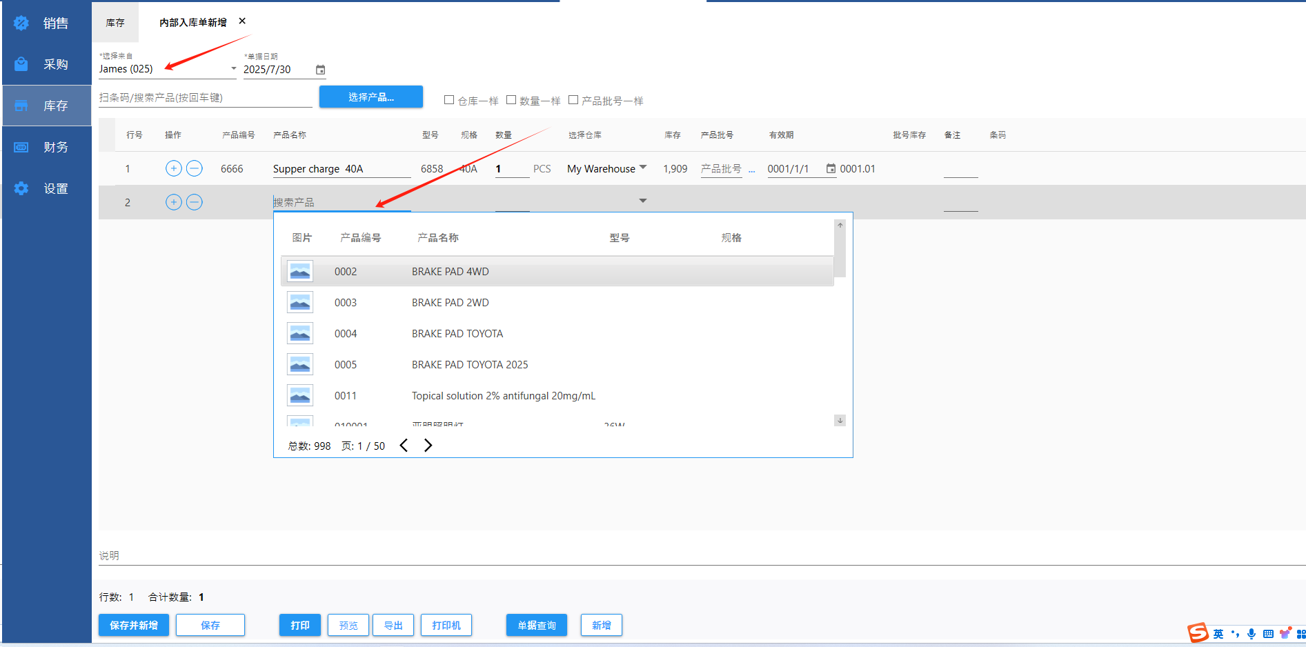 内部入库单是指将产品从内部的部门或个人入库到公司仓库(而非来自供应商),开内部入库单库存会增加。