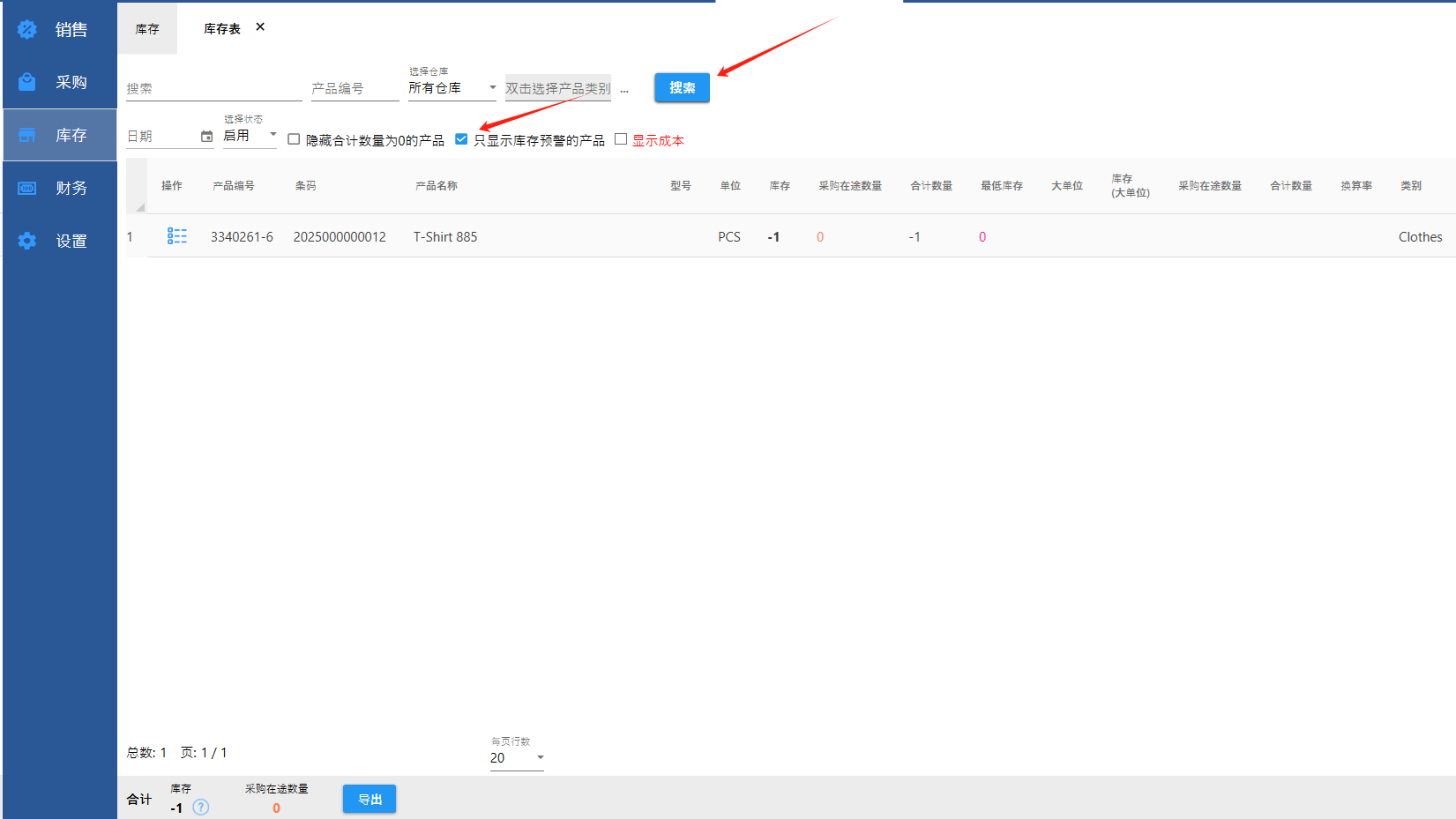 ,然后单击搜索按钮,可以查看哪些产品低于最低库存,需要及时补货(可以导出Excel)